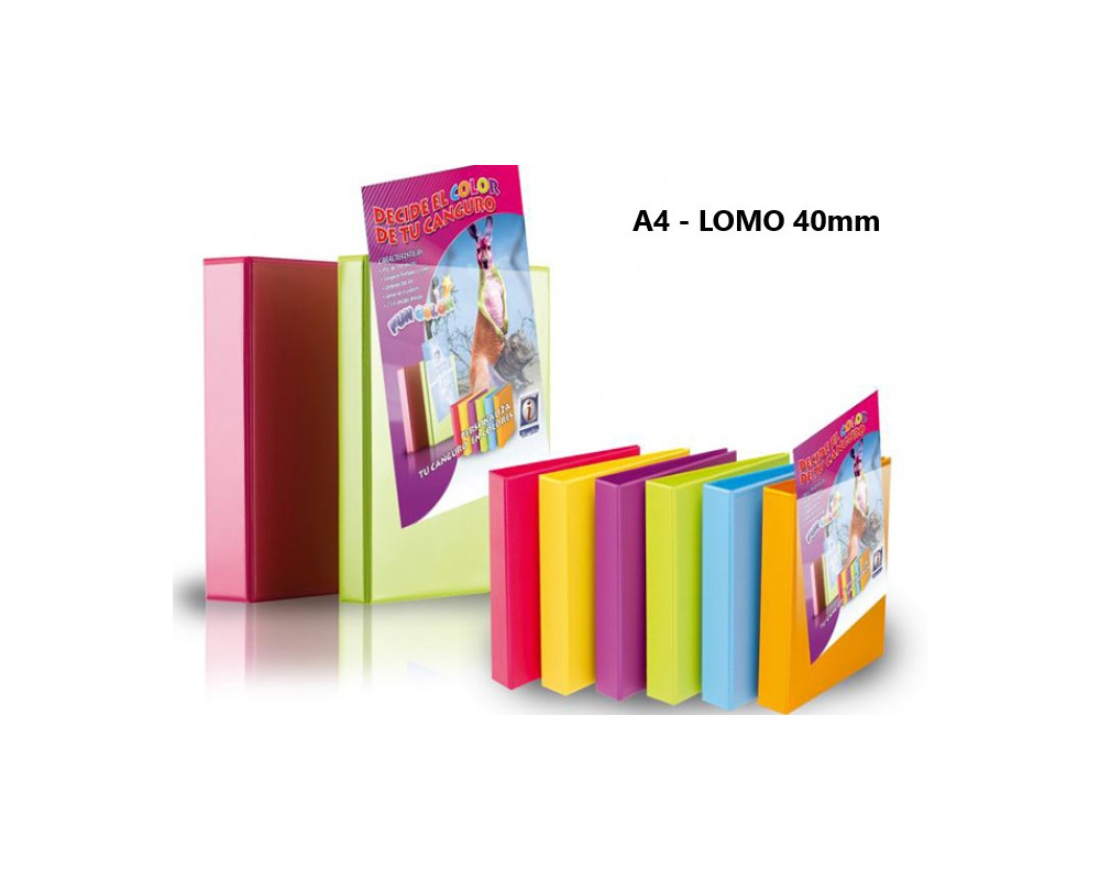 Carpeta canguro de anillas mixtas. Fabricada en cartón forrado de plástico PVC libre de ftalatos. Colores modernos y vivos colores FUN COLOR (verde pistacho, azul cielo, rosa, morado, amarillo, naranja). Incorpora bolsillo interior y compresor. Permite la personalización en: portada, contraportada y lomo. Formato A4. Unidades / Caja: 10.