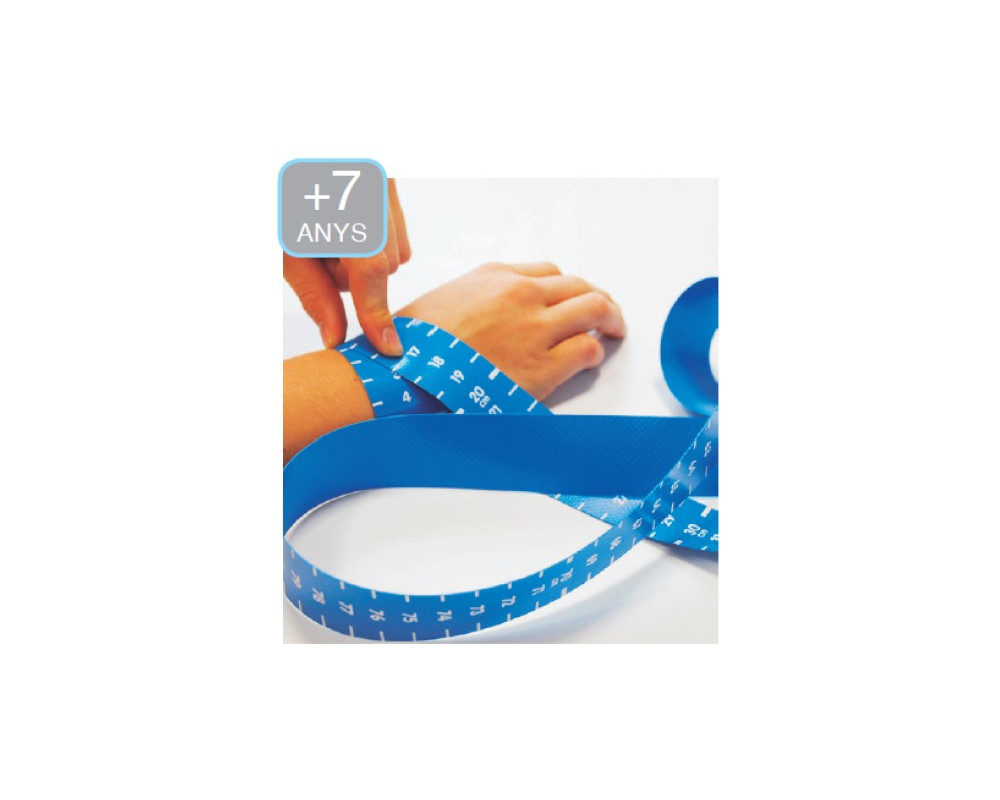 Cinta mètrica de color blau graduada en centímetres.